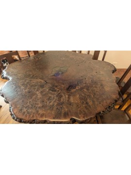Rare and prized walnut burl dining table. single slab all burl, live edge. Over 5 feet diameter