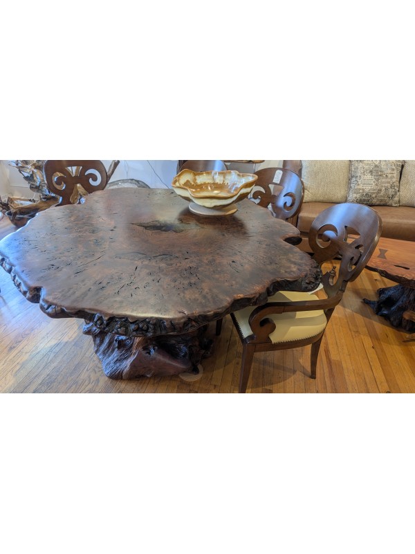 Large and beautiful slab of claro walnut bulr dining table. 5 feet diameter. Locust base.