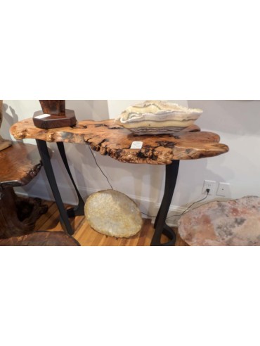 Dramatic maple burl slab. Live edge all around. The slab retains its cambium edge, the dark accents on the slab. Matched with a modern metal base that enhances the variation in color of the slab.